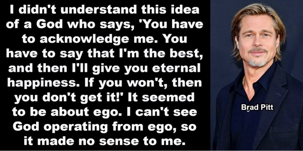 Posted in Movies & TV | Tagged Brad Pitt, Brad Pitt Christianity, Brad Pitt religion, Christianity, Does God have an ego?, Faith, faith blog, Frank King, Frank King blog, Frank King Christianity blog, Frank King faith blog, Frank King religion blog, Frank King spirituality blog, Frank's Cottage, God, Jesus, Jesus Christ, religion, religion blog, Ross Carkner, spirituality, spirituality blog, theology, who created humanity?, who created people?, who is God? | 1 Comment »