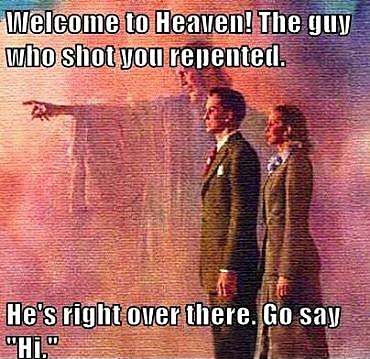 So when the murder victims depicted in the graphic above get to Heaven and are directed to the person who shot them, they will ABSOLUTELY go over and do more than say “Hi”. They’ll hug that person with overflowing love.