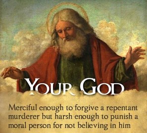 If you think about this meme, you’ll realize what it’s really claiming: the creator and master of time, space and universe is a moral sicko who deserves to be scorned by all rational people.